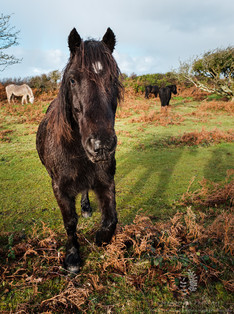 I chose to go straight on, briefly reading the Information board provided by the National Trust about the rare flora and fauna protected by their management as well as the Napoleonic wars era Watch hut. Then I met them, the welcoming committee. This consisted of four Dartmoor ponies who rapidly advanced led by one with a flash of white on his (or her) brow. Now one Dartmoor pony on its own is quite cute, but four with one about a foot away was a little intimidating. It was evident that they equated the presence of a human with food, despite the sign warning not to feed them. I nervously patted the leaded on its nose, but although it accepted this, it was not what it wanted and the group drifted away. The encounter did of course provide a good opportunity to break free of my comfort zone and take pictures of the animals in their natural environment as they grazed and played.
